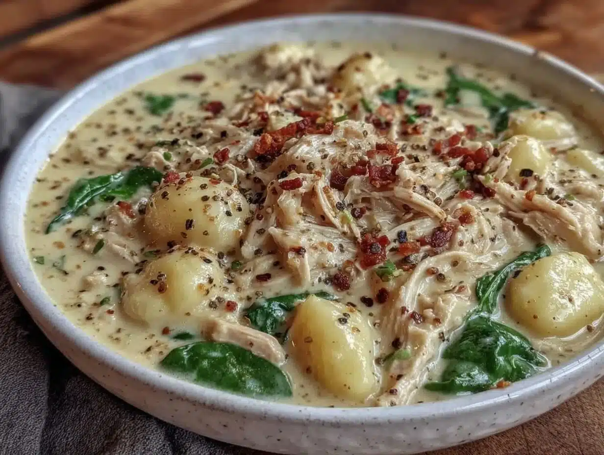 A cozy, creamy chicken gnocchi soup inspired by Olive Garden, featuring tender chicken, pillowy gnocchi, fresh herbs, and a silky broth perfect for cold evenings or quick dinners.