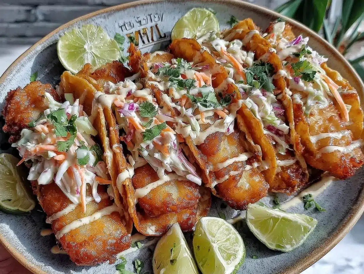 7. Assemble the Tacos: Place a few pieces of crispy fish on each tortilla, top with a generous scoop of lime slaw, and drizzle with chipotle crema. Add fresh lime wedges on the side if you like.