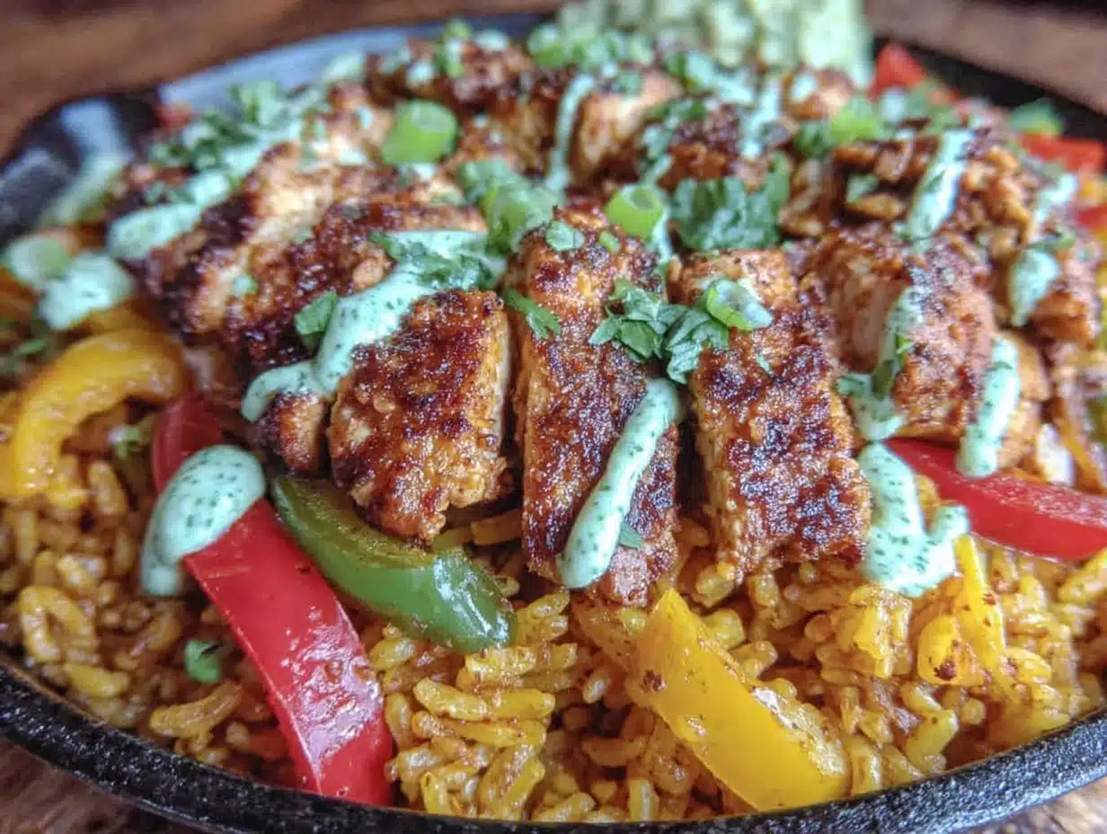 A quick and flavorful one-skillet chicken fajita rice bowl with smoky spices, sautéed peppers, and a tangy lime crema, perfect for busy weeknights.