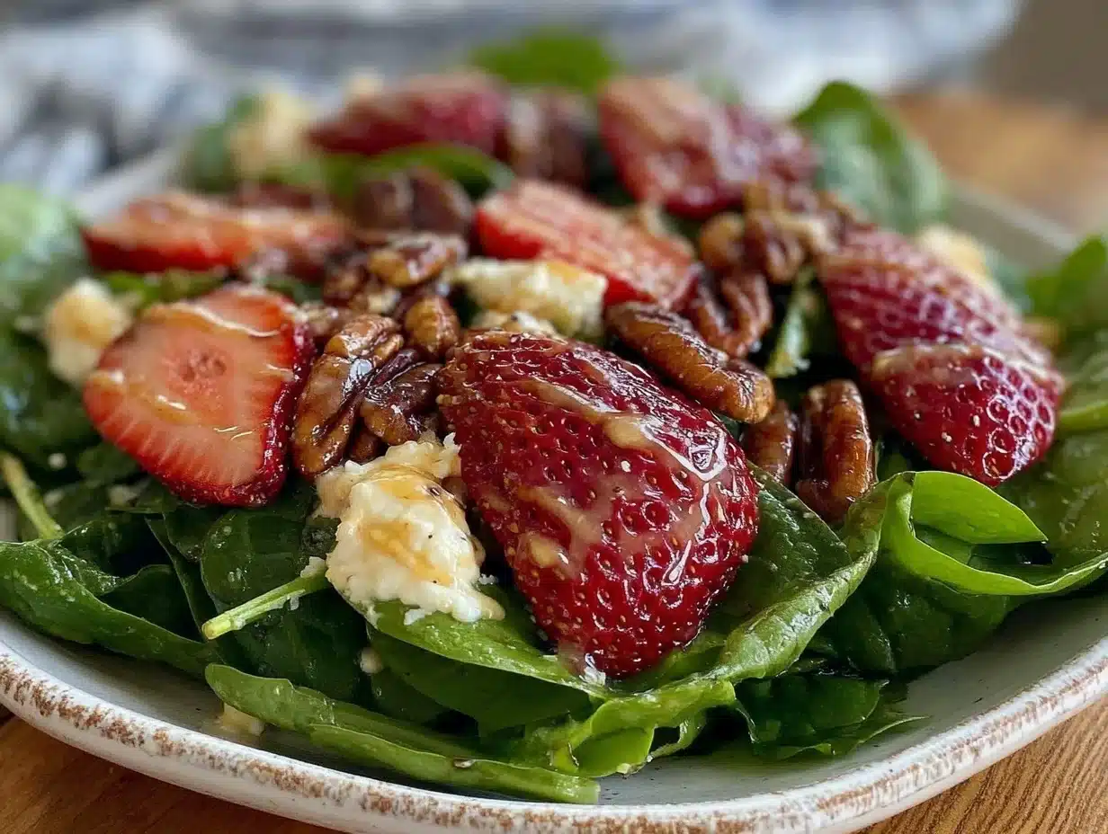 A vibrant and refreshing salad combining fresh baby spinach, juicy strawberries, toasted pecans, and a homemade poppyseed dressing with a perfect balance of sweet and tangy flavors.