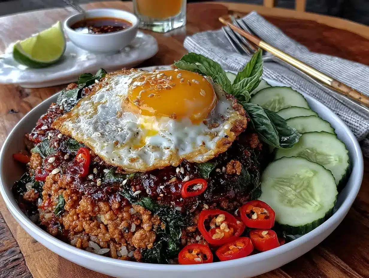 What sets this recipe apart is a couple of chef tricks I’ve picked up over the years. I use a two-step stir-fry method that keeps the chicken juicy but allows the sauce to get that caramelized edge. And honestly, nothing beats the pop of flavor from fresh holy basil—it’s what gives this dish its signature taste. If you can’t find Thai basil, regular basil works in a pinch, but the difference is worth seeking out. Plus, topping it all with a crispy fried egg is my not-so-secret weapon for next-level satisfaction. This recipe isn’t just food—it’s an experience. It’s the kind of spicy, savory meal that makes you close your eyes after the first bite and just…smile.